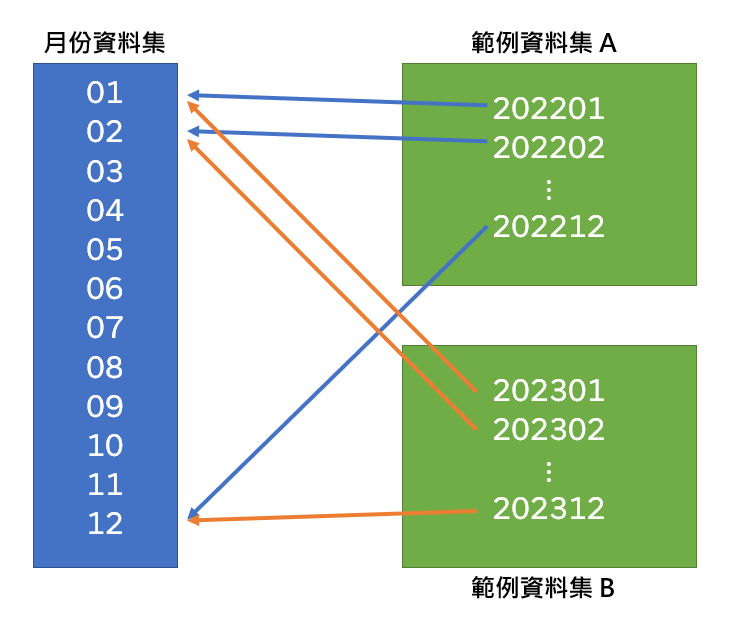 因為我們必須讓圖表知道說,我們想要將數據以月份為主要維度,將不同年份的資料分別整併在各個月份中。而透過這個新建置的 1~12 月份的資料來源,就可以幫助我們做到這件事。透過下圖可以幫助大家理解這個概念: