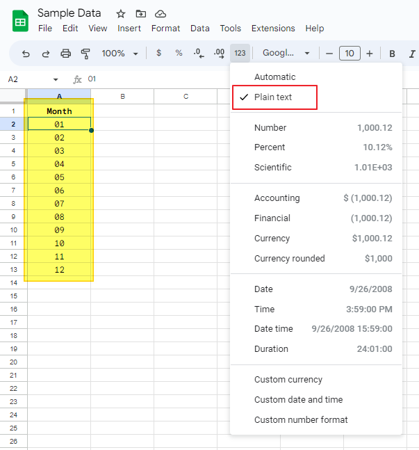 6-1. 建立的方式很簡單,可以透過 Google Sheet 建立一個欄位,裡面輸入 01, 02, 03, …12,並將格式調整為文字格式 (Plain text)。選用文字格式的原因是因為到時候我們在報表排序時,因為如果是數值格式,到時候依據數字排序順序會變成 1, 10, 11, 12, 2, …這樣。因此為了避免這樣的問題,我們統一讓它是 2 碼的日期格式。因此建立好大概會長成下圖: