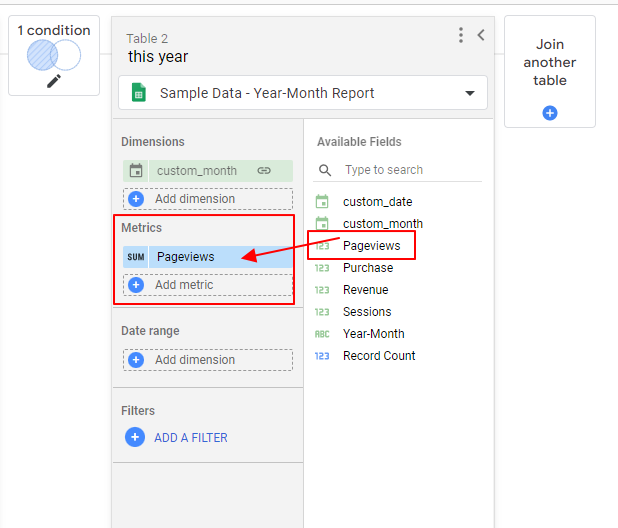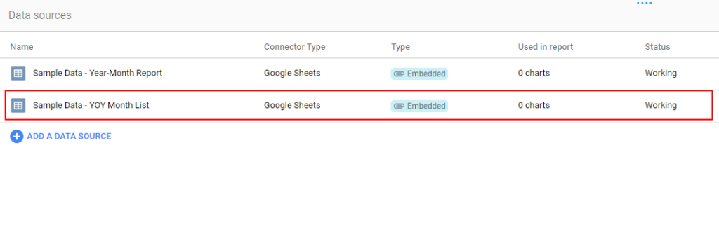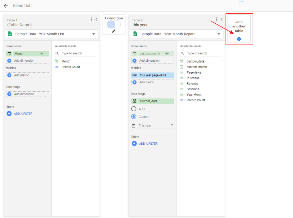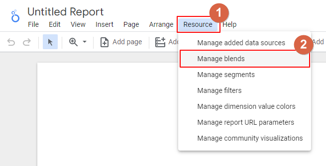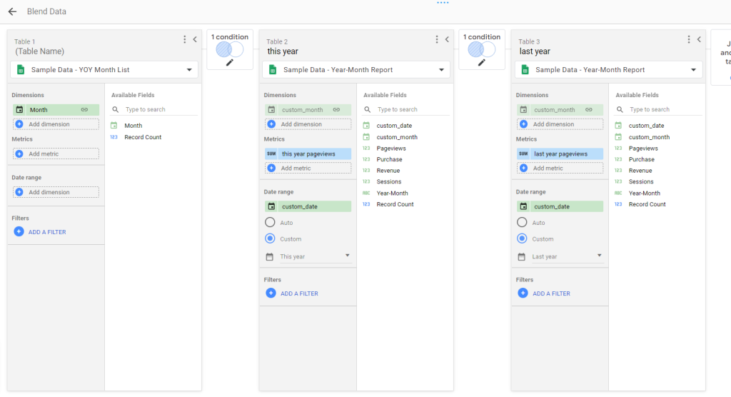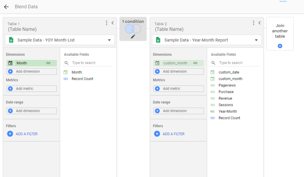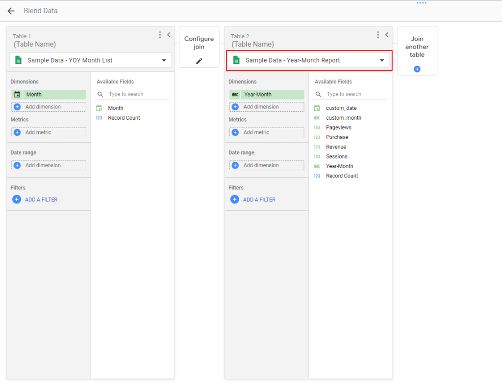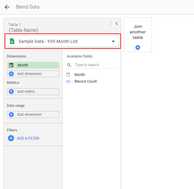 7. 資料都準備完成後,接下來我們要處理的,就是將數據以「月份為主要維度」將不同年份的資料分別整併在各個月份中。這部分我們會使用到 Looker Studio 的混合資料 (blends) 來完成。操作方式為: