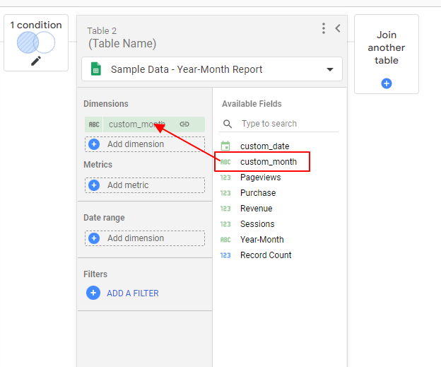 註4*:若您右手邊的地方無法選擇到步驟 4 所建立的欄位時,請先按下取消 (Cancel) 回到前一個畫面,將 custom_month 這個欄位拉到右側資料表的 Dimensions 中,再回來操作即可選取