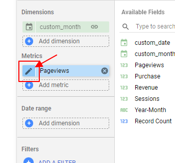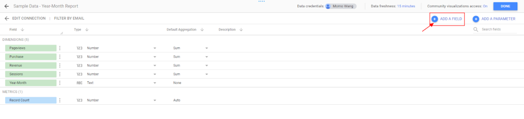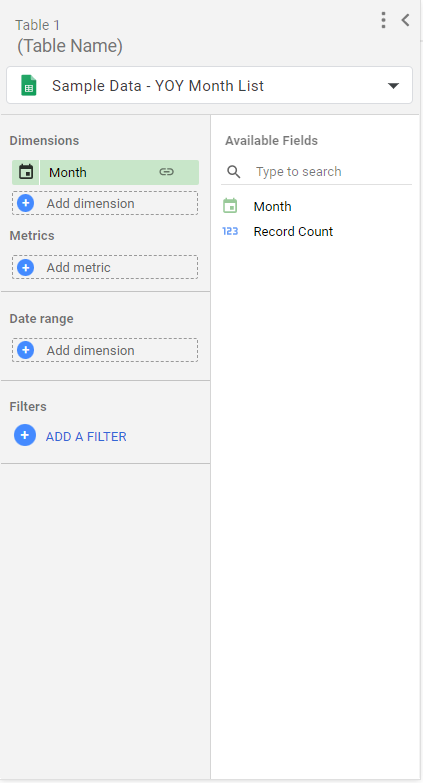 - 製作此類型的報表,會需要使用到「日期」、「月份」兩個欄位。因此若來源資料並沒有包含此兩個欄位或是有缺少的話,需從原始資料進行補充,或是可以透過 Looker Studio 從匯入資料中透過公式來產生對應的欄位