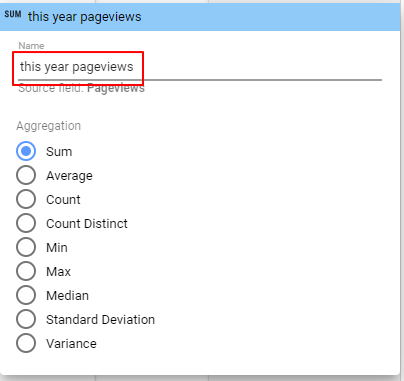 9-3. 一樣為了方便識別,我們更改一下這個指標名稱,滑到前面的 SUM 字眼,會發現圖示變成一枝筆,然後點擊它,在上面的地方輸入「this year pageviews」,以便我們後續作識別