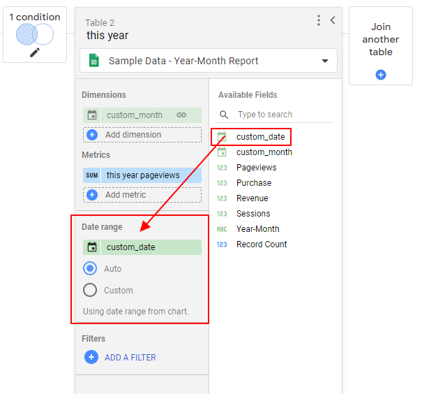 9-5. 當放進來之後,會發現下面有「自動 (Auto)」與「自訂 (Custom)」兩種模式可以選擇。自動 (Auto) 的意思是不指定日期,會依據報表上面的日期控制項來調整資料選取區間,而自訂 (Custom) 則可以讓我們自行指定這個資料表的資料範圍。因為我們目前將這張資料表定義為今年 2023 年的資料,因此我們就選擇「自訂 (Custom)」,並將區間調整為「今年 (This year)」