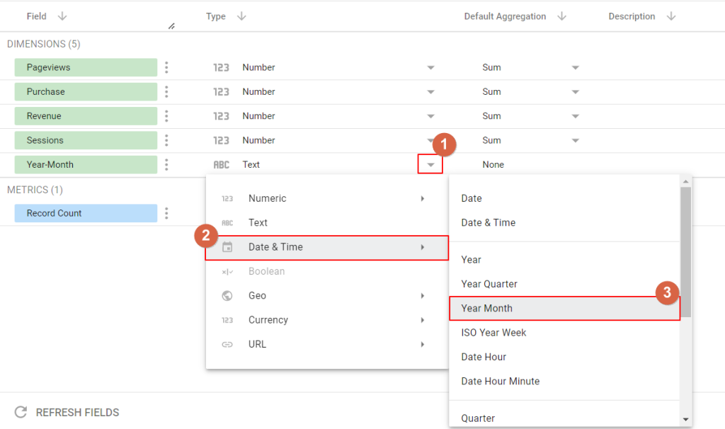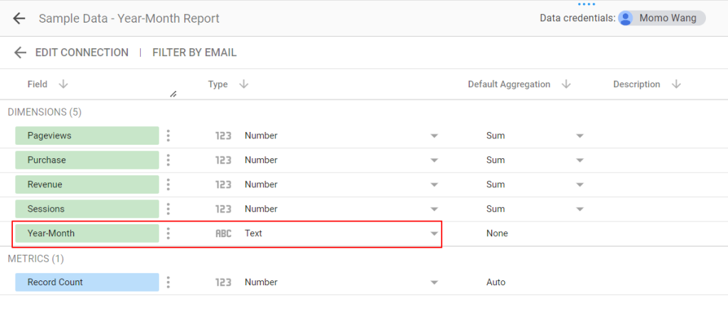 3-3. 找到日期欄位「Year-Month」,點擊右手邊的下拉選單,將類型從 文字(Text) 更改為「日期和時間 (Date & Time) \ 年月 (Year Month)」