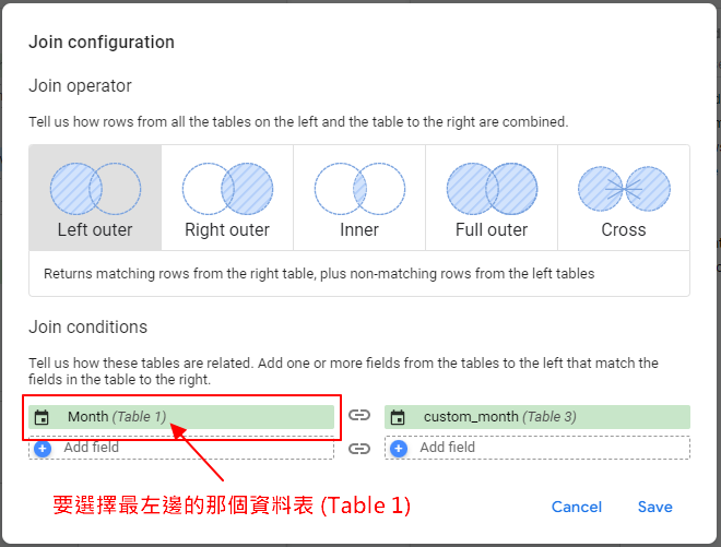 7-5. 我們要選擇的條件是「左外部彙整 (Left Outer)」,而串接兩張資料表的主要欄位 (Key) 是月份,因此左手邊的地方要選擇月份資料表中的月份欄位 (此例為 Month),右手邊的地方要選擇範例資料表中的月份欄位 (還記得我們在步驟 4 的時候,有透過公式新增一個月份欄位 custom_month 嗎) (註4*)
