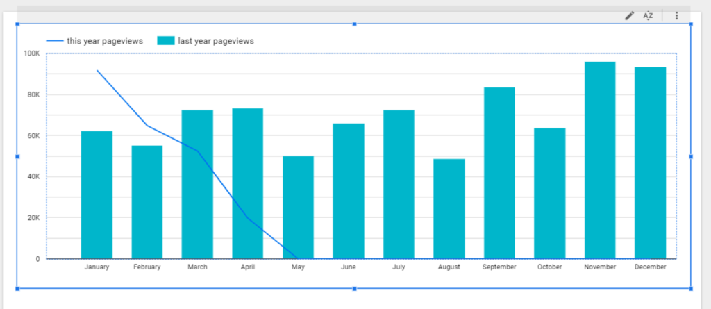 終於,我們成功製作出藉由長條圖顯示去年與今年的瀏覽量差異變化!