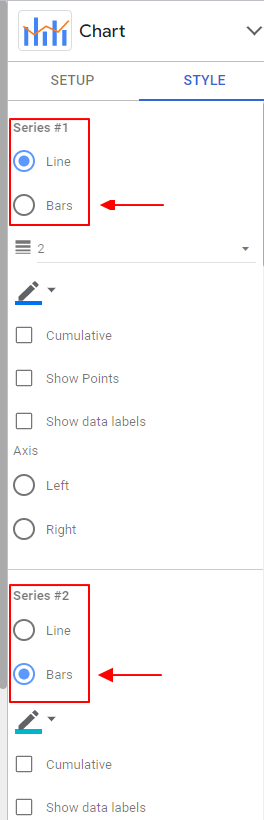 在數性資料中可以找到 Series #1 與 Series #2 的地方,指的就是兩個指標要呈現的圖形樣式。因此我們只要都將它調整成長條圖 (Bars) 即可!